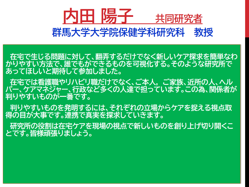 『客観的かつ科学的な判断と在宅ケアを利用する人々の意向を通じた,わかりやすいケア構築をもって社会の発展に貢献する』ことを理念に、次世代への新しい提案・提言を行っていくことが使命であると考えております。