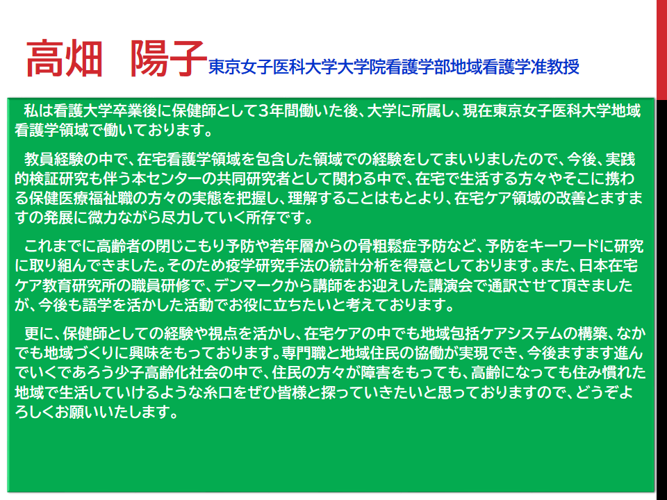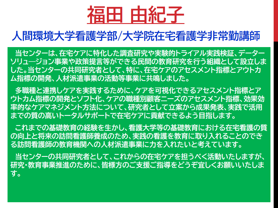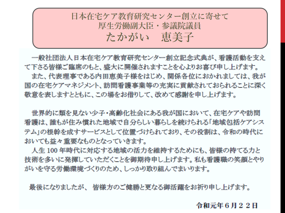 2019年 一般社団法人日本在宅ケア教育研究センター 代表理事