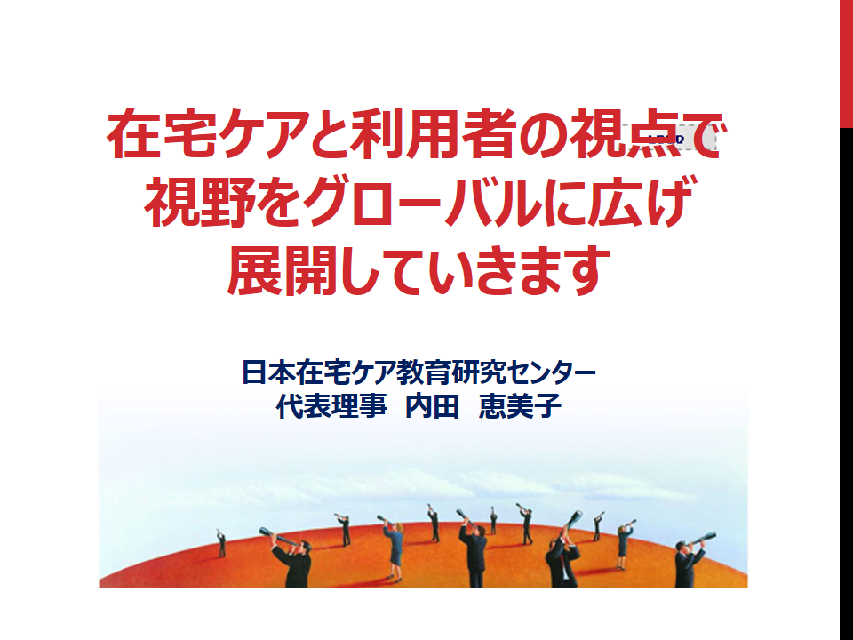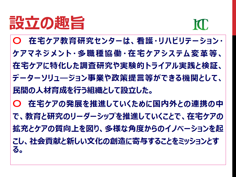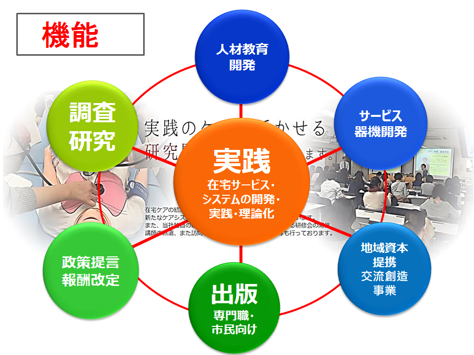 私共は、在宅ケアに関連する調査研究、政策研究・提言、セミナー、訪問看護ステーションや居宅介護支援事業所等運営サポート、コンサルティング等を通じた人材育成支援など、国内外にわたる幅広い在宅ケア分野における多様なつながりをもちながら、我が国の在宅ケアが発展するよう、(株)日本在宅ケア教育研究所のシンクタンクとして非営利の教育研究センターを創立しました。